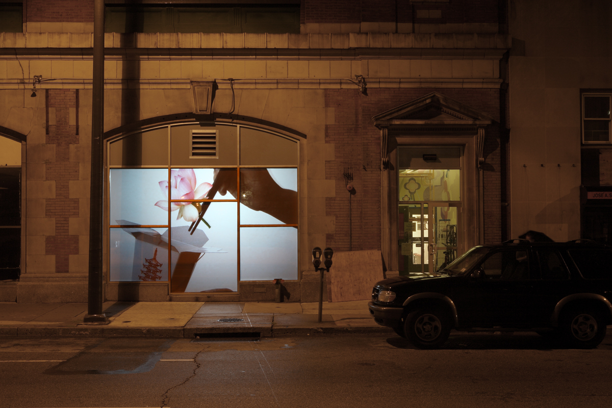 Nadia Hironaka’s Strange Stories from a Chinese Studio, is visible only after dark, on the window of the Asian Arts Initiative, 1219 Vine Street. It is part of Asian Arts’ second Chinatown In/flux exhibition, this one subtitled Future Landscapes. This outing, there are four (or six, depending on who’s counting–two of them are matched pairs of a sort) public art projects scattered around the Chinatown neighborhood.